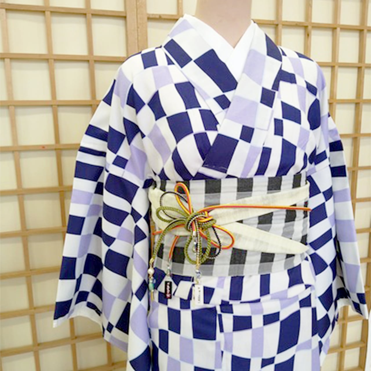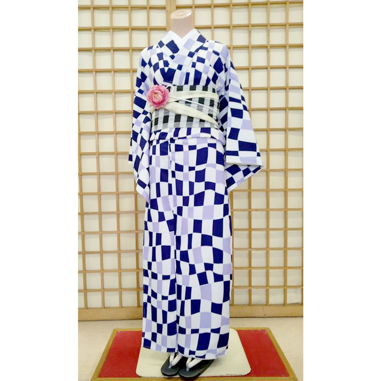 変わり市松柄の洗える着物と市松柄の洗える小袋帯と刺繍入り鼻緒のウレタン草履の3点セットです。