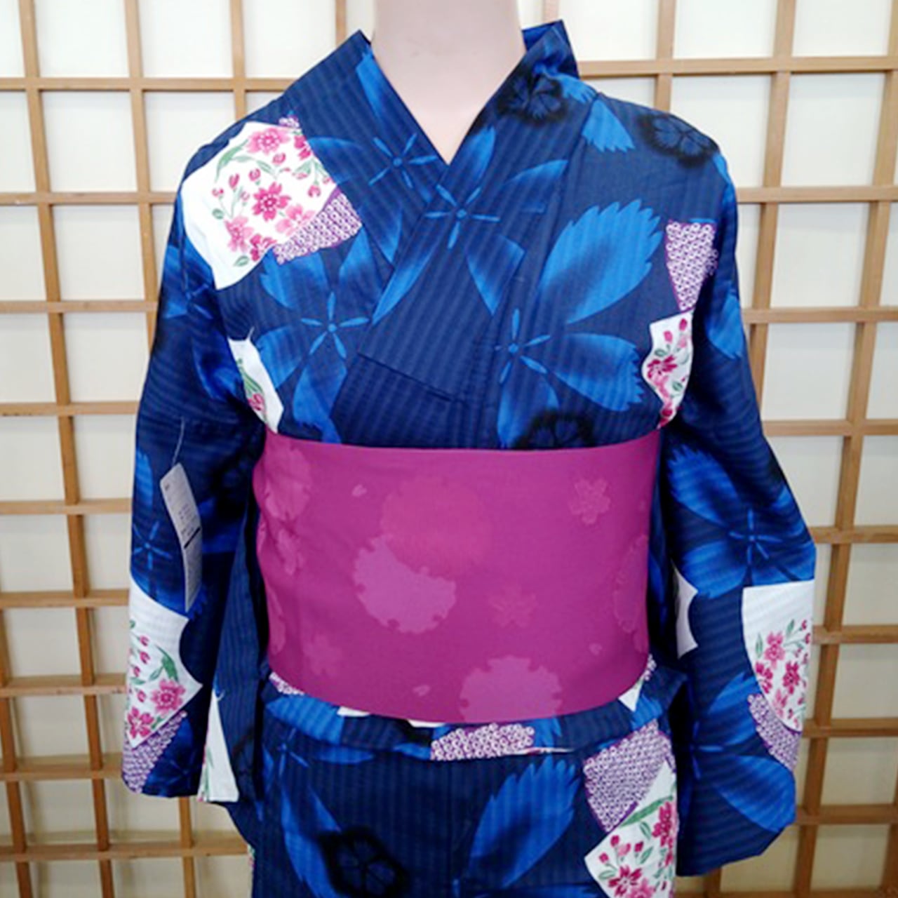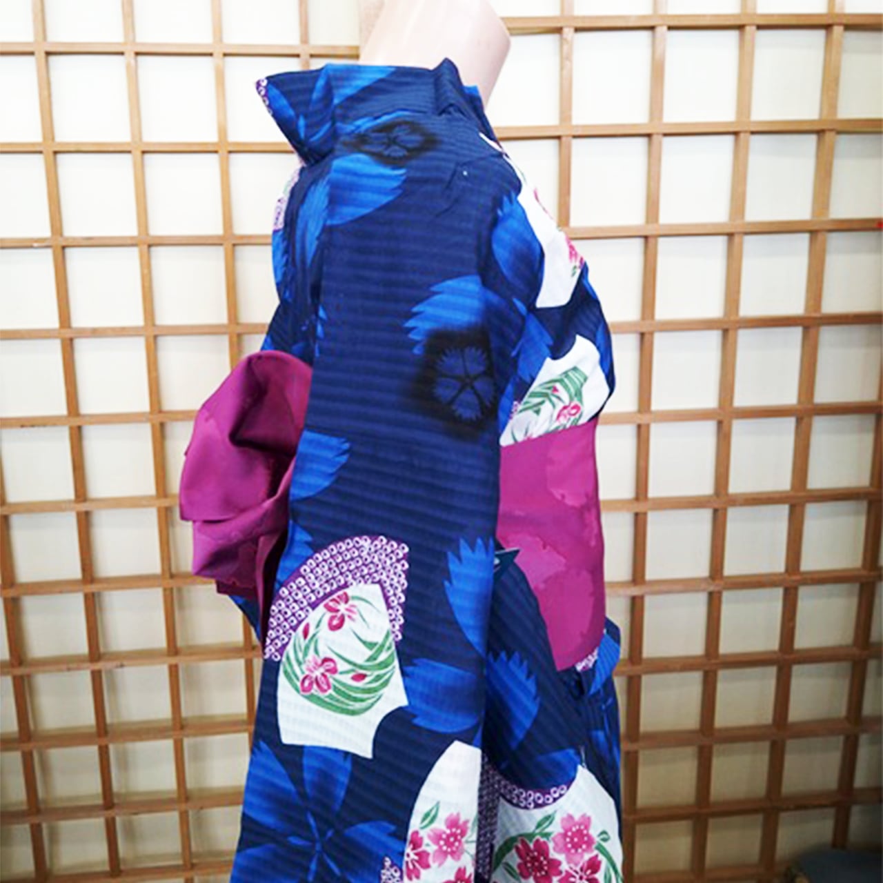 古典的な扇面の柄の中にさくらやあやめ絞り調の柄が入った浴衣です。